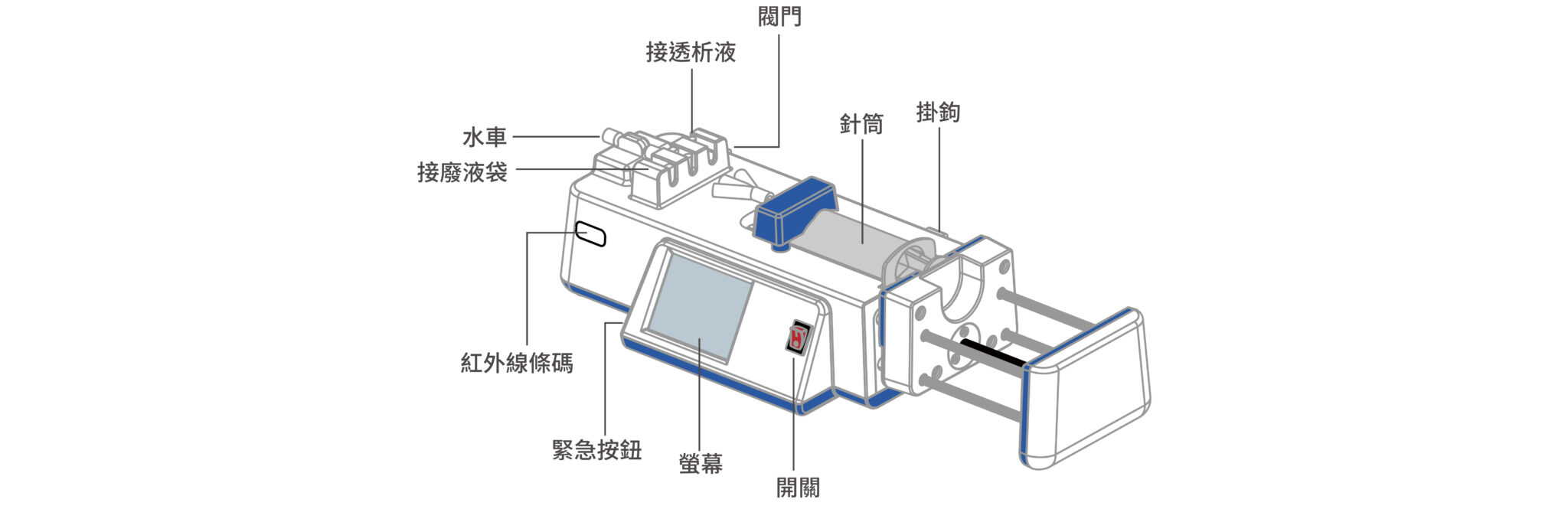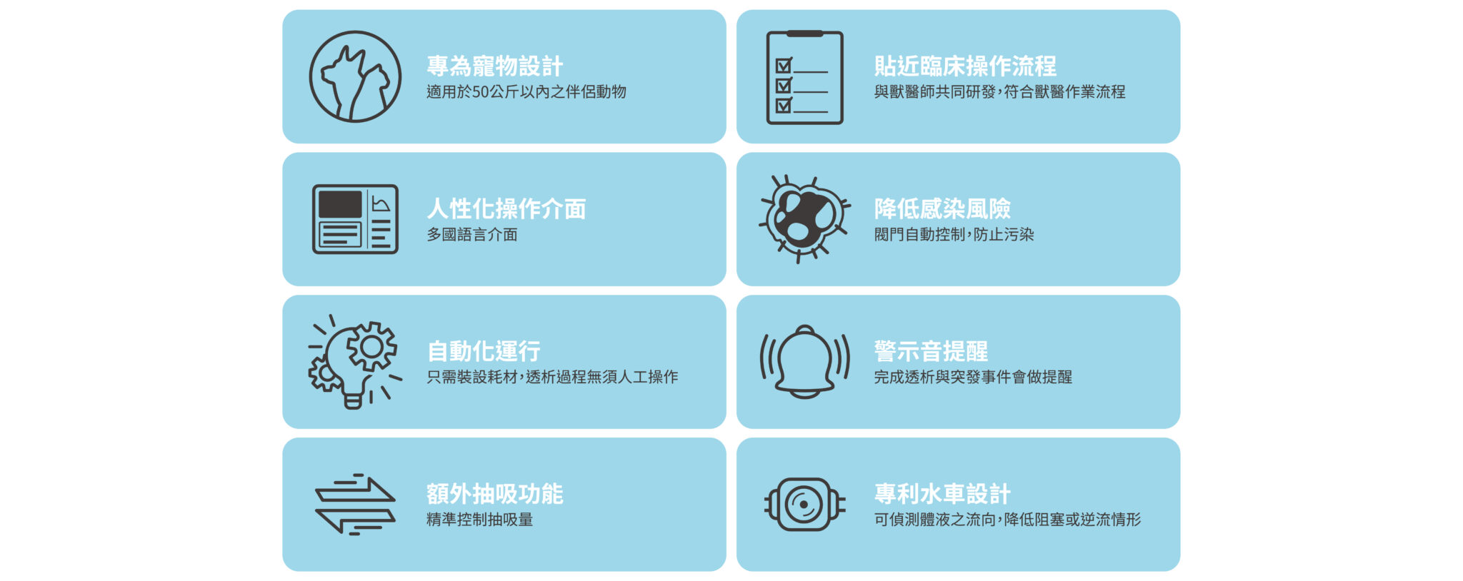 • 自動化運行 : 只需裝設耗材,透析過程無須人工操作